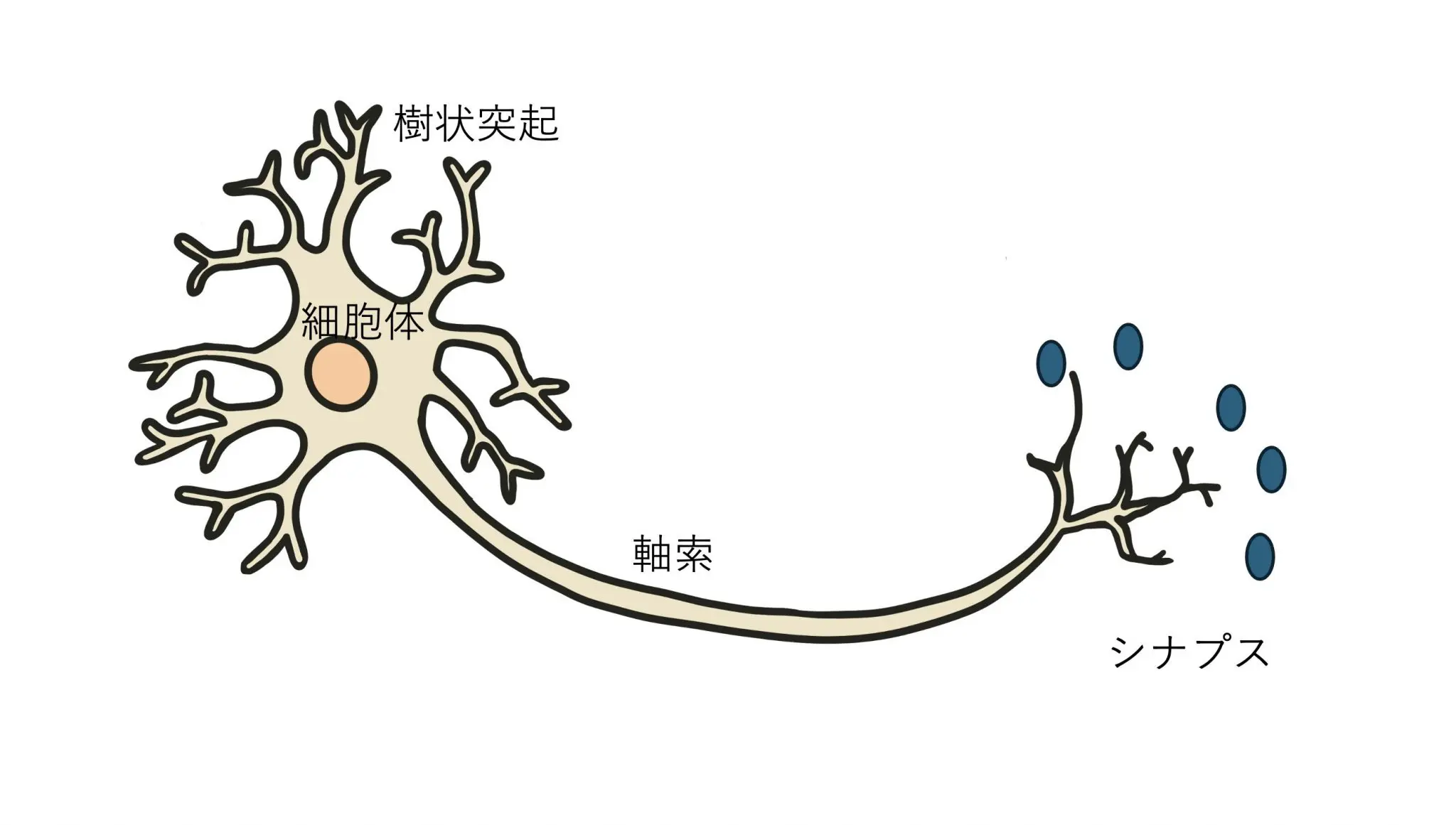 神経には細胞体と言って神経細胞の中心部分で、核となり情報を処理しする部分と、樹状突起や軸索と言って他の神経細胞からの信号を受け取ったり、信号を次の神経細胞に送ったりするところがあります。