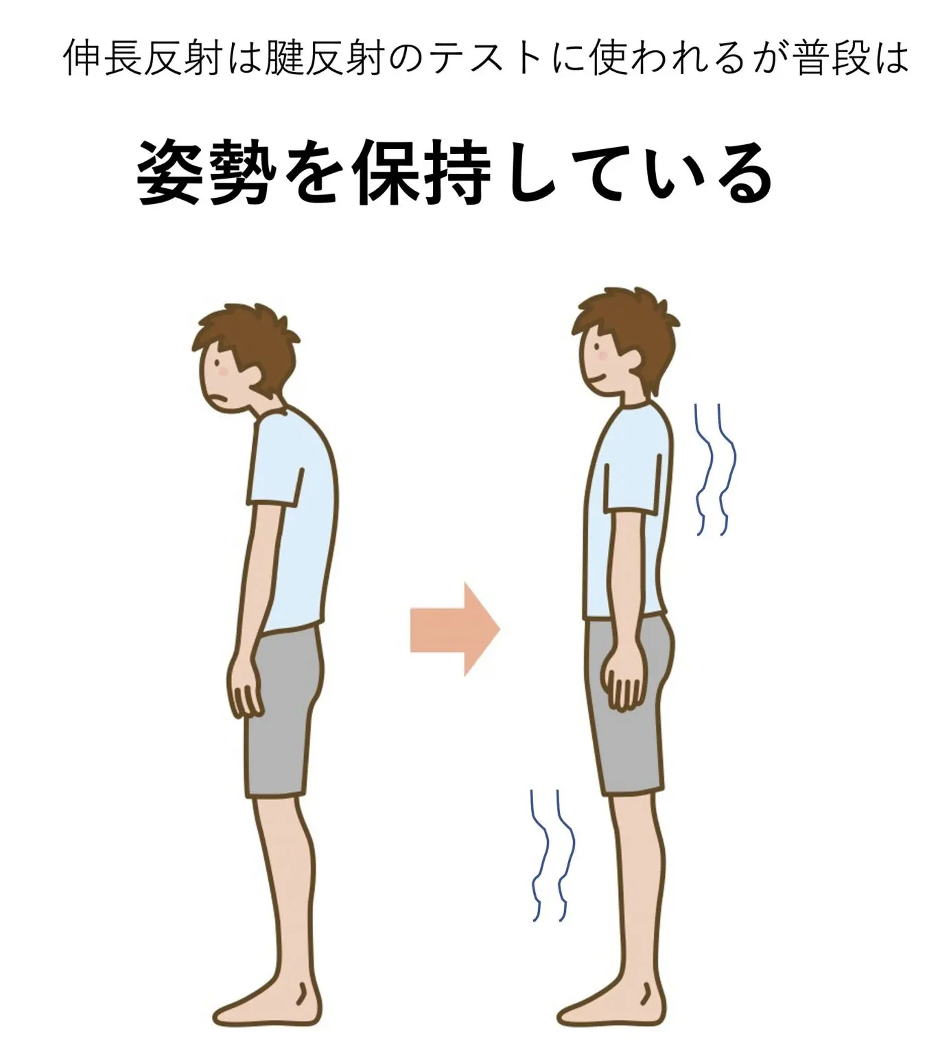例えば、ひざをたたくと足がピョンと跳ねる反射は、伸長反射の一例です。