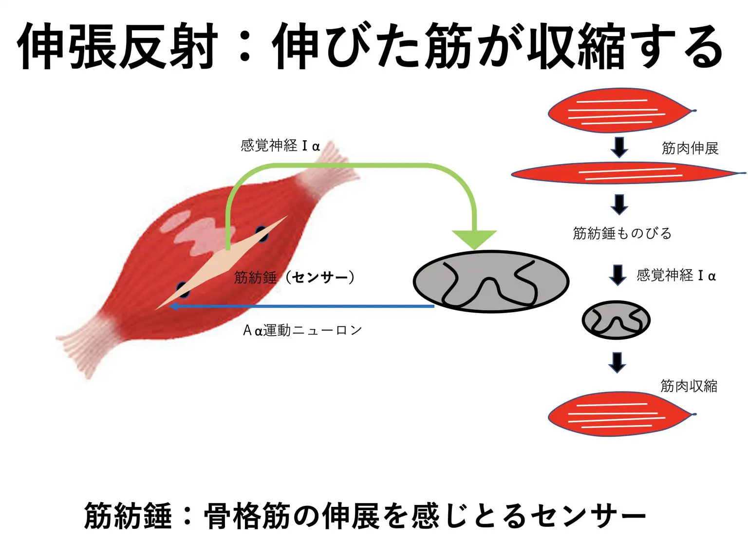 - 筋紡錘(きんぼうすい):筋肉の中にあるセンサーで、筋肉の伸びを感知します。