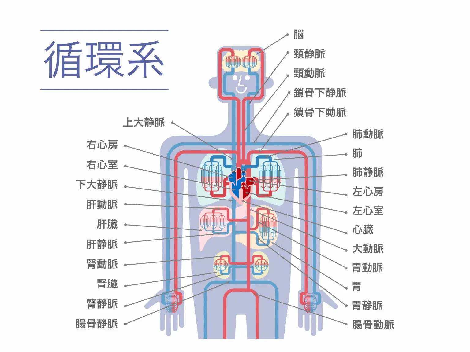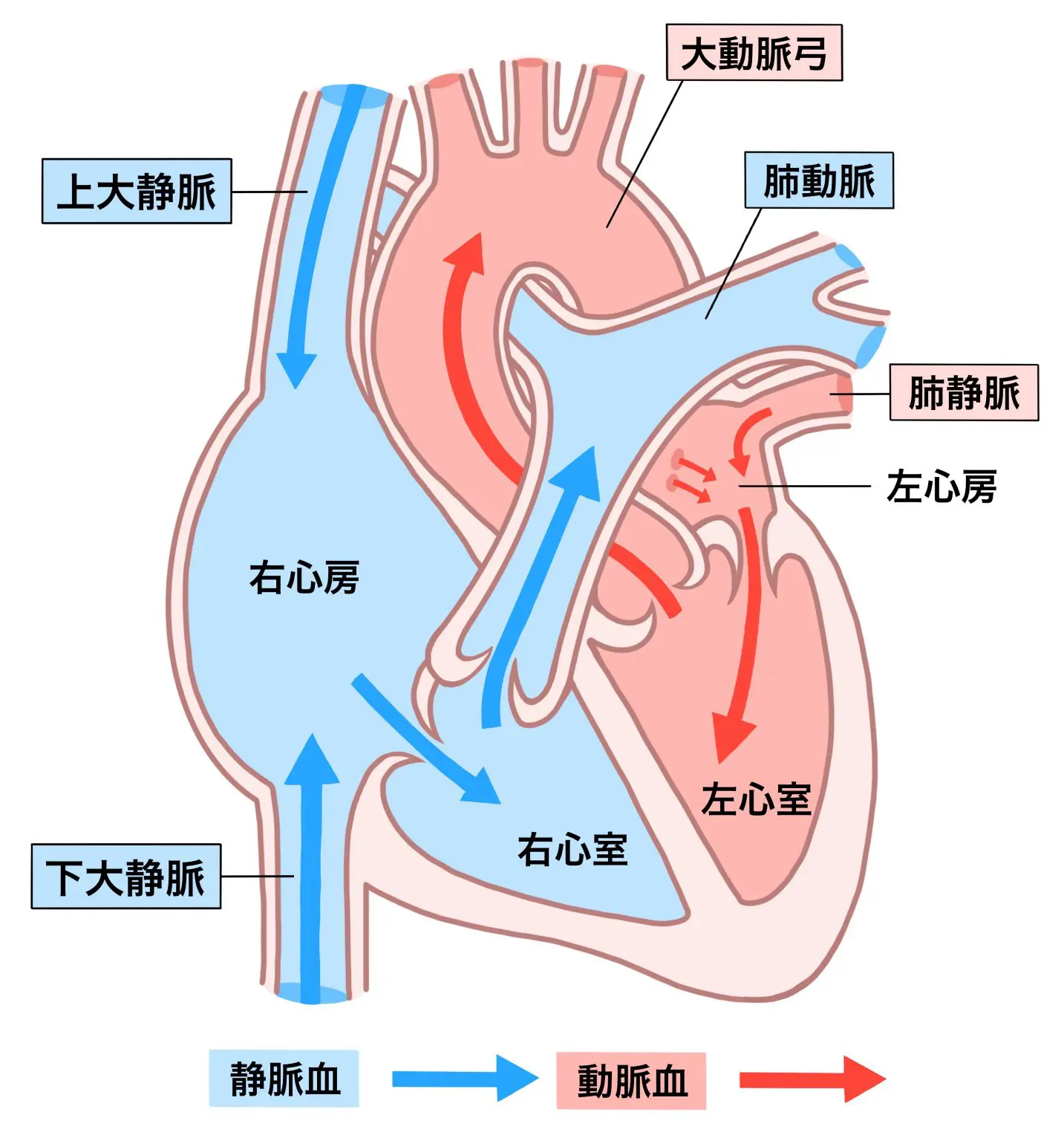 - 静脈:酸素を使い終わった血液を心臓に戻します。主な静脈には上下大静脈があります。静脈は小静脈から集まった血液を心臓に運びます。