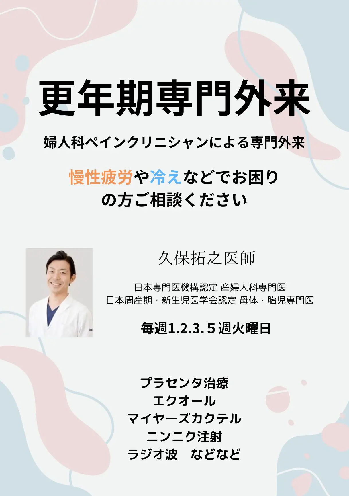 そこで、婦人科で研鑽を積みながらペインクリニシャンとして活躍している久保拓之医師を毎週火曜日(第4週以外)にお招きしました。