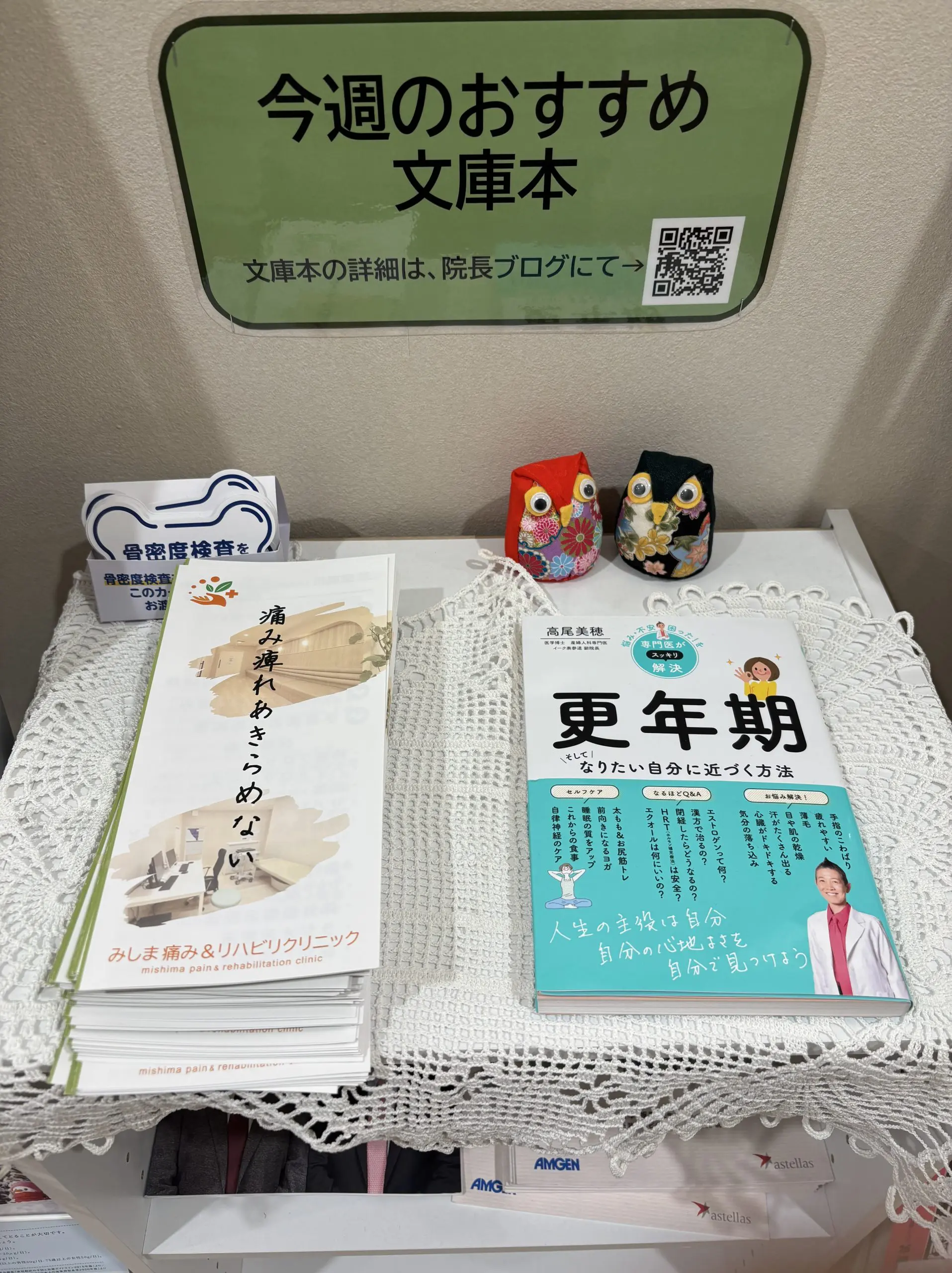 また、こちらに2月のおすすめ本として、更年期障害に対しての文庫本を置いております。