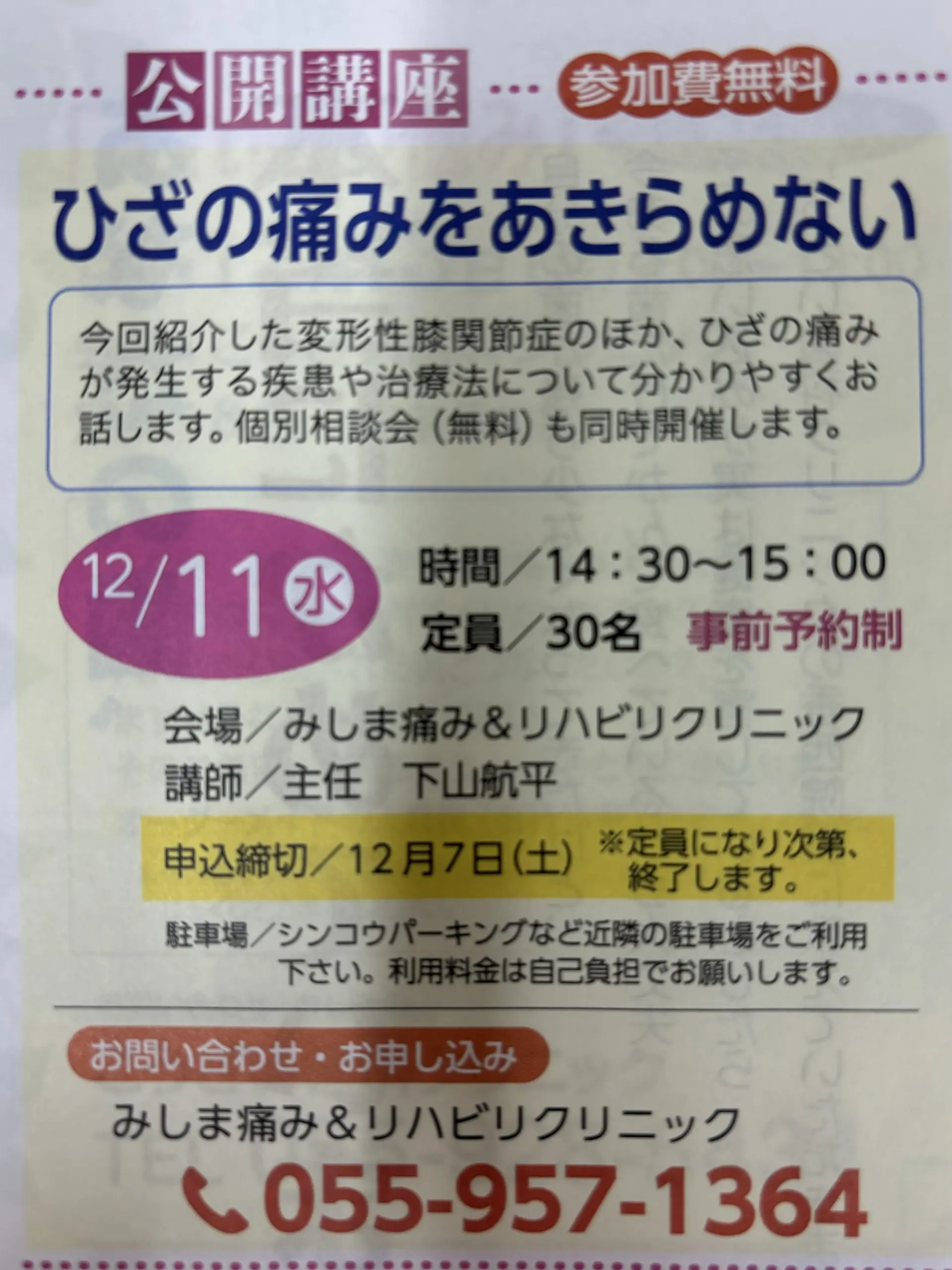加えて、ハッピーステージに再度掲載させていただきました。12月11日に患者さん向けの公開講座を予定しております。理学療法士による簡単なエコーでの評価もありますのでインソール相談や膝についてお困りの方は是非お越し