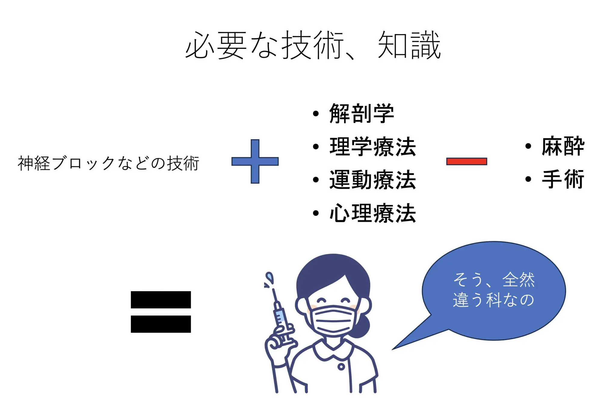 神経ブロックの技術はできて当たり前なところですが、一番重要なのは解剖学だと思っています。ただ、解剖学も実際のご献体を触れる機会は極端に低いため、すぐに知識として生かせるのは理学、運動療法になります。