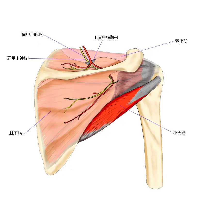こんな感じで、棘上筋、棘下筋、小円筋、そしてこちらには書かれていないですが前方に肩甲下筋があります。これら4つの筋肉が腱板になります。