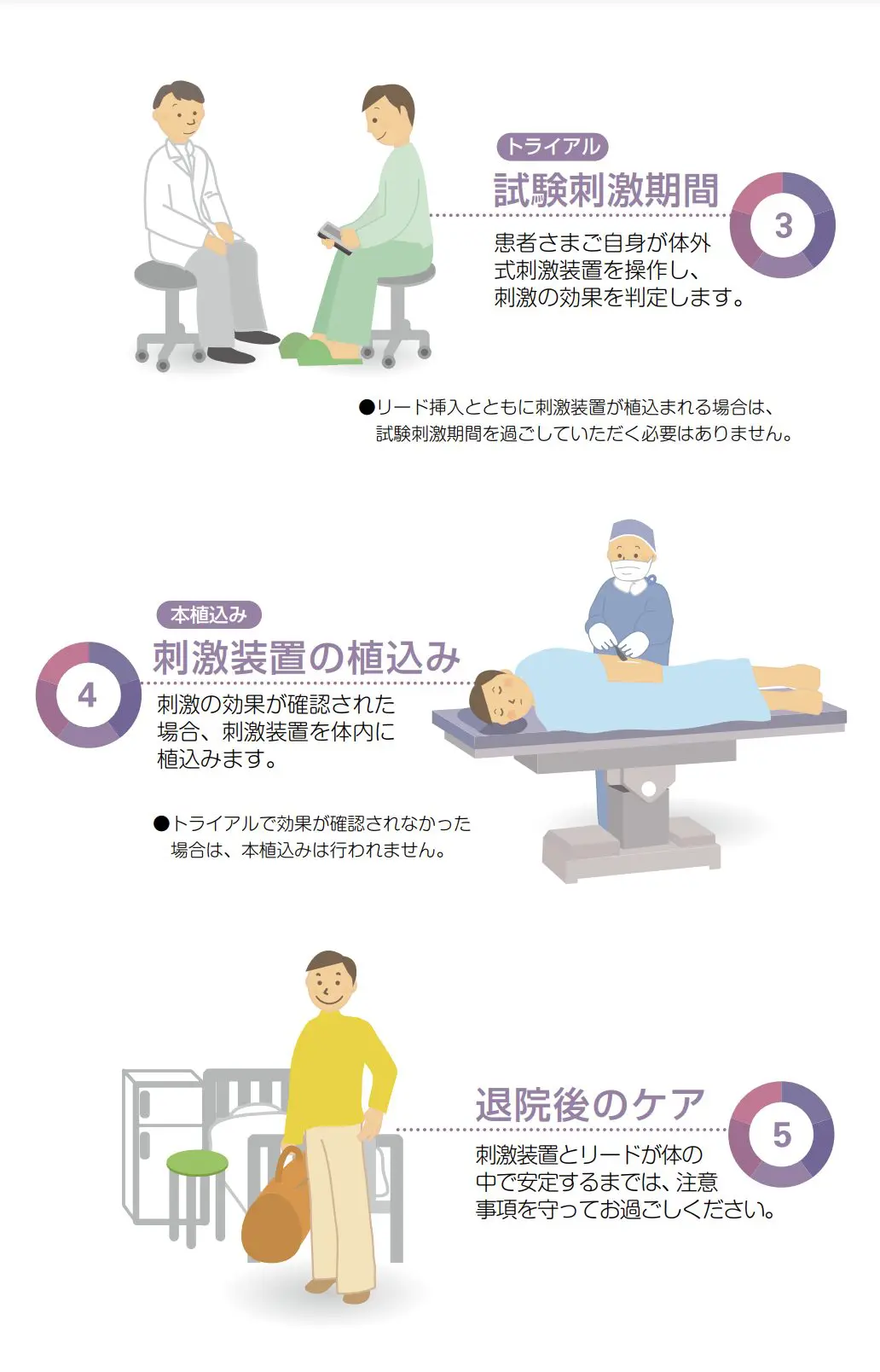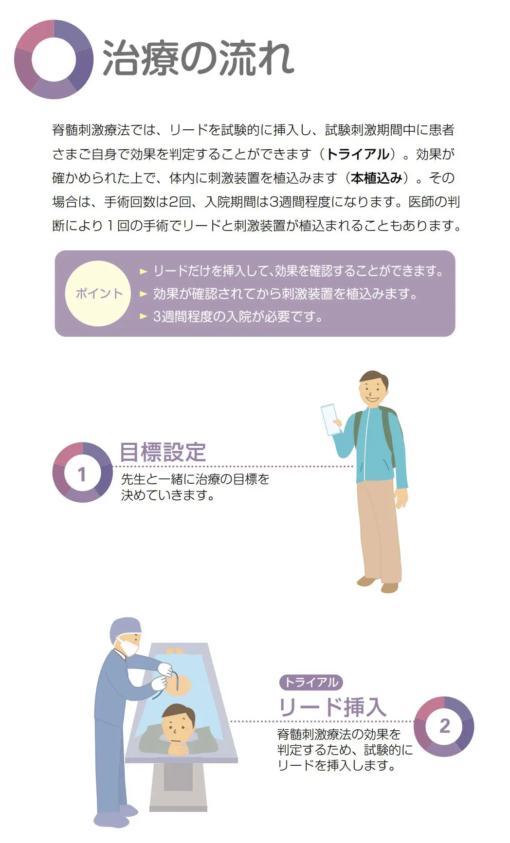 治療を始める前に、まずは「トライアル」と呼ばれる試験期間があります。この期間中、一時的な電極が脊髄に近い部位に挿入され、痛みへの効果を評価します。このトライアルが成功し、痛みが明らかに軽減されることが確認されれば、長期的な治療のための装置が体内に埋め込まれます。入院が必要ですがその間に効果判定を行います。