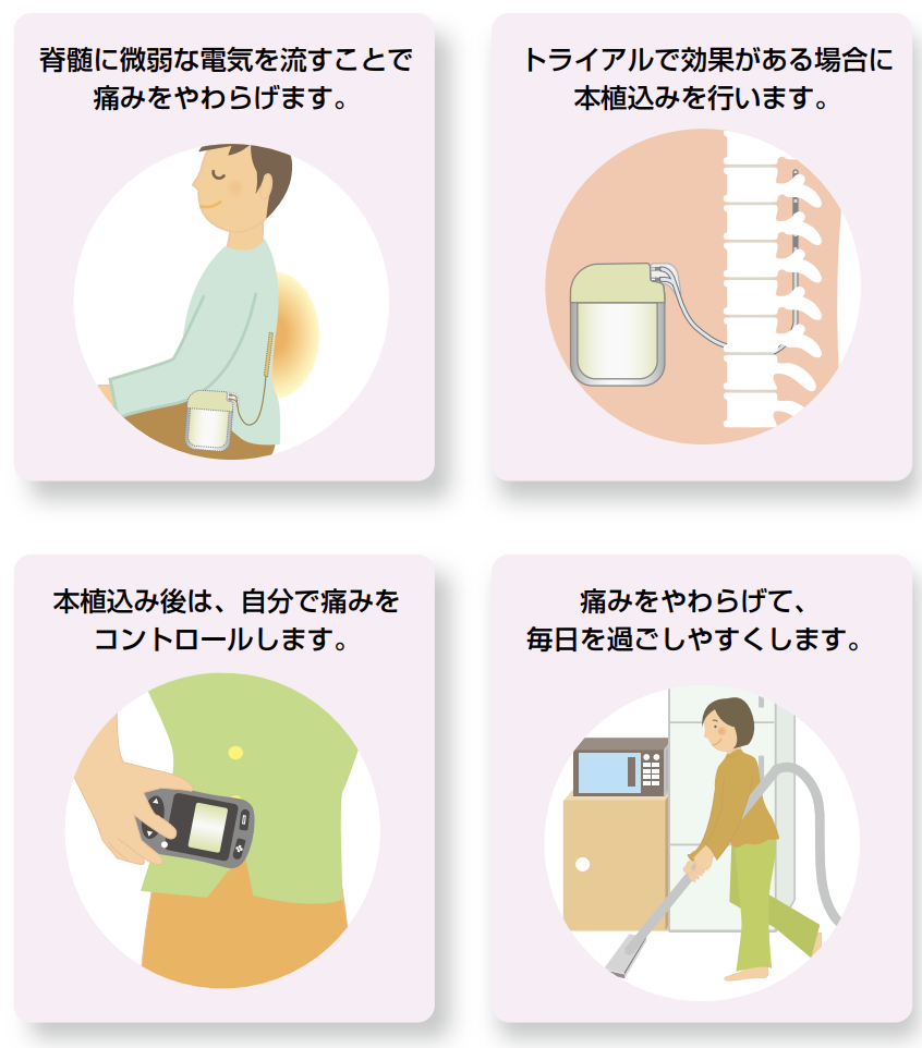SCSは、神経の異常による痛みや血流障害による痛みなど、慢性難治性疼痛に効果があると言われています。