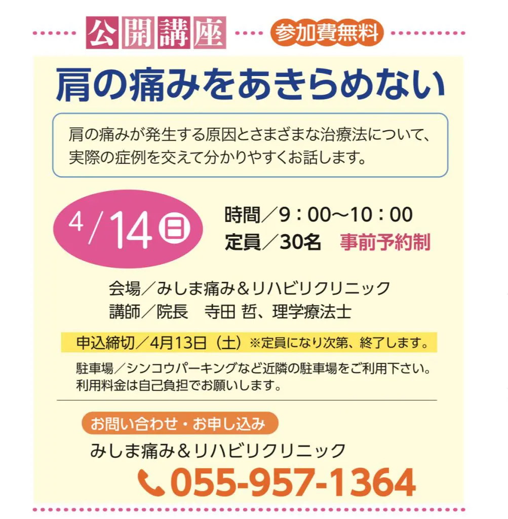 次回は4月14日を予定しておりますが、医療者向けにセミナーを行うその前に、一般の方向けの講演として三島市の方先着30名の方に限り、肩痛の説明会をしようと思っております。痛みで気になる方はご参加下さい。