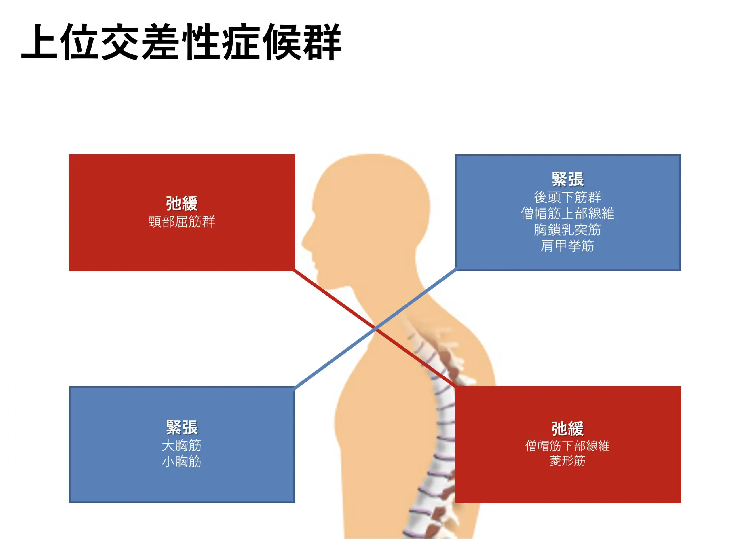 一般的に上位交差症候群のように、姿勢が悪くなりTOSを生じている方は緊張している筋肉を緩めて、弛緩している筋肉を鍛えることが重要です。筋肉の硬さを取るにはハイドロリリースで筋肉内または筋肉と筋肉の間をリリースしたりするの方が効果的であると思ってます。