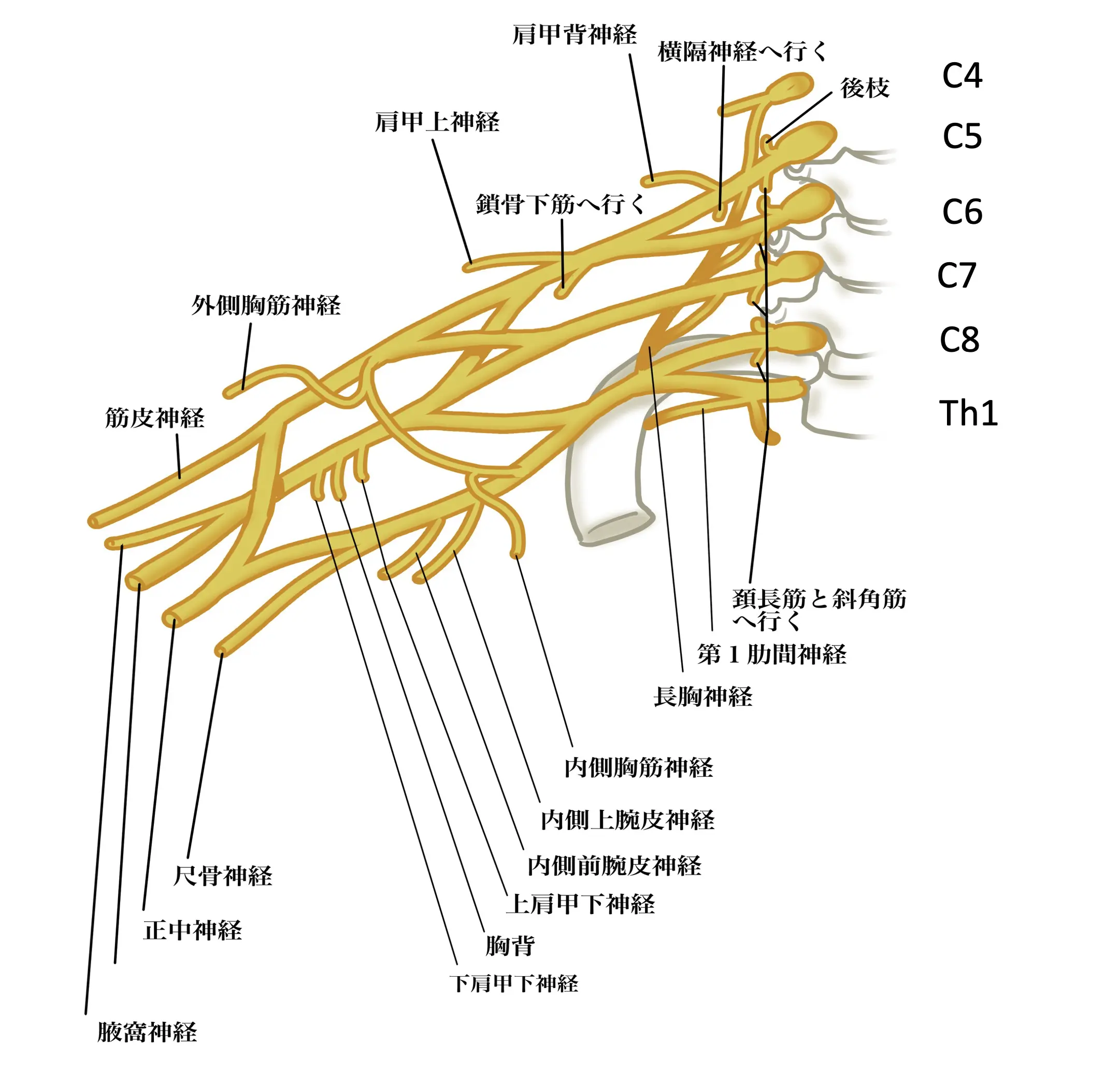 腕神経叢(brachial plexus)は、頸髄(C5~C8)と胸髄(T1)の神経根が合流して形成される神経の束で、肩から腕、手にかけての感覚と運動を司ります。