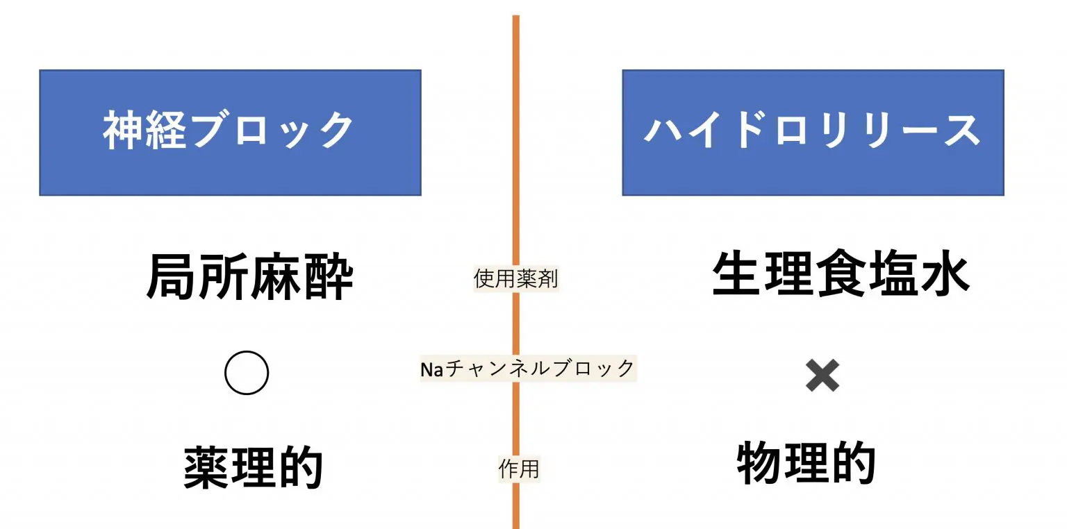 神経ブロックとハイドロリリースとの大きな違いは下記の表の通りです。