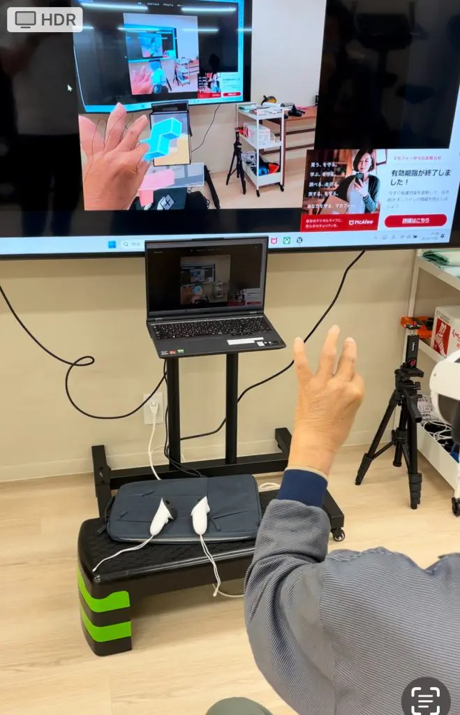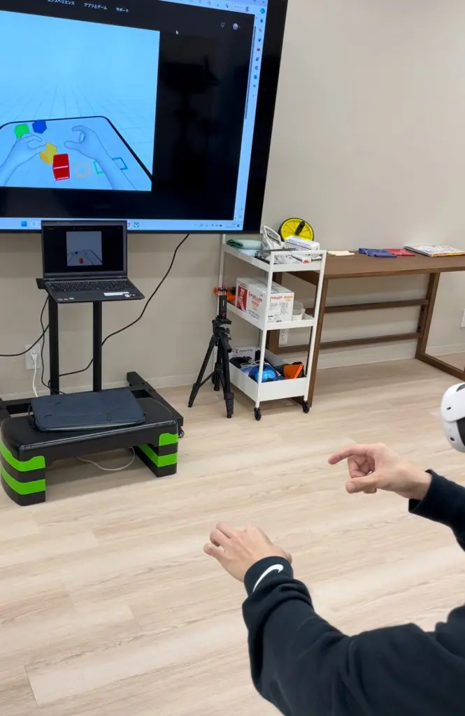 下の画面をご覧ください。当院でのリハビリテーションにVRやMRを行っているところです。